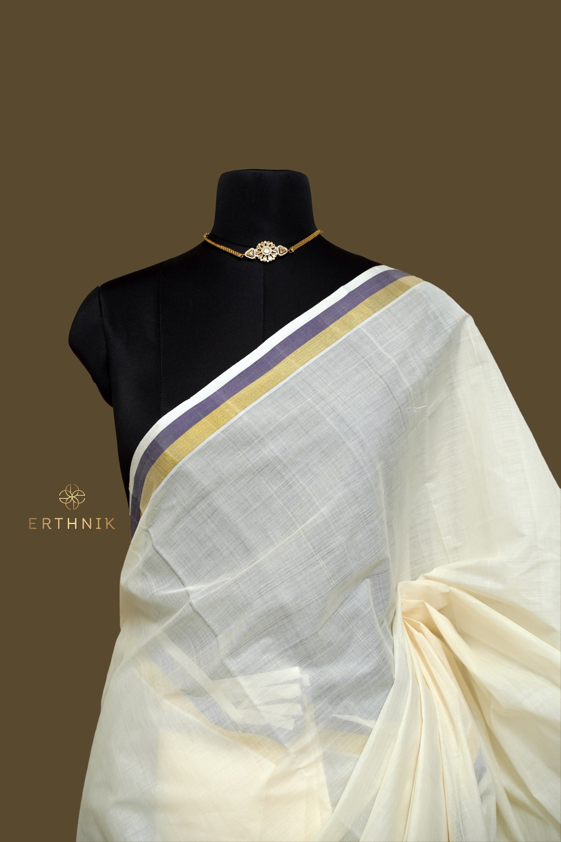 Classic off-white pure cotton saree with blue kara and golden zari borders. Lightweight and handwoven by skilled artisans in Chendamangalam.