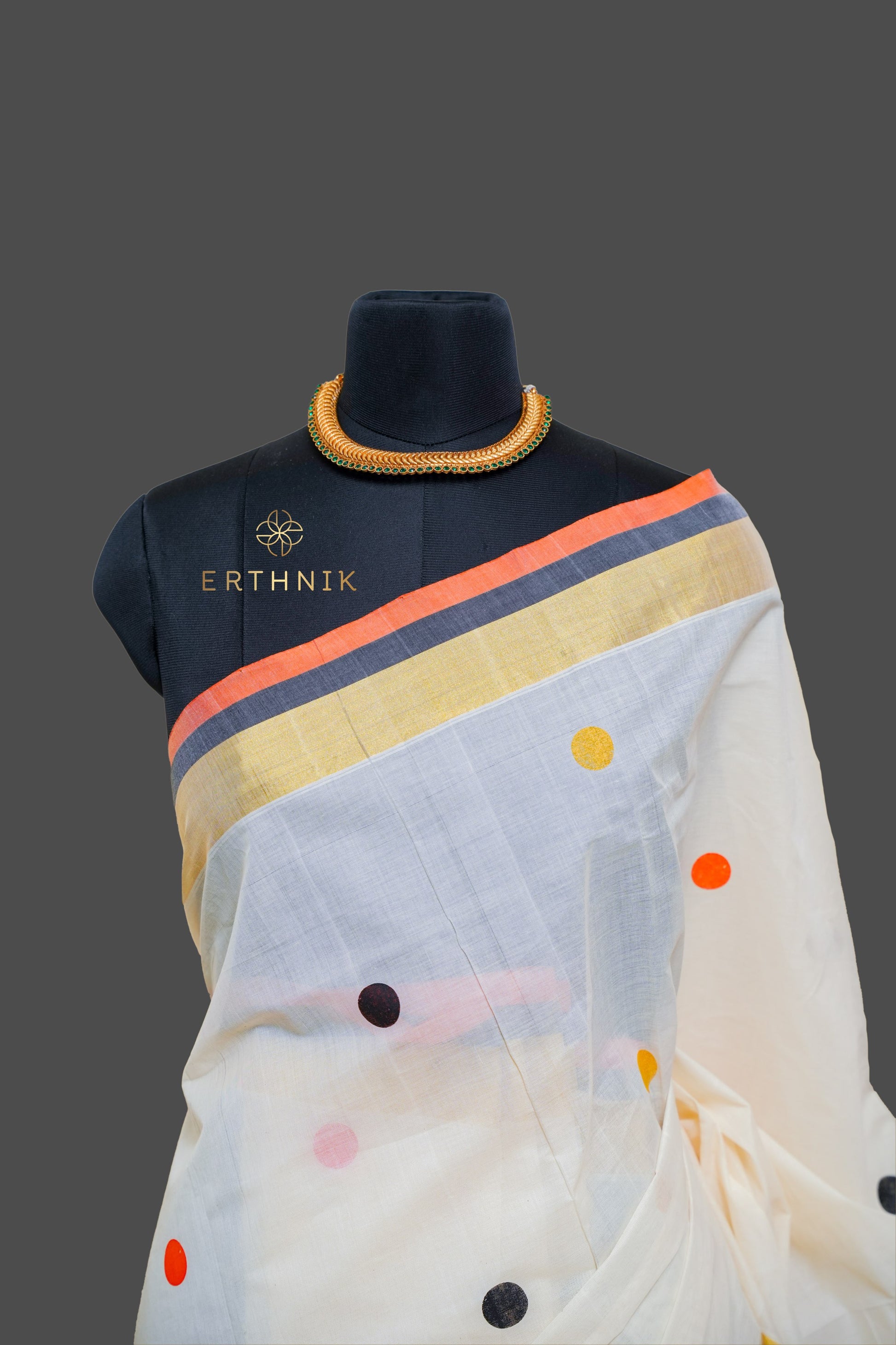 Erthnik™ Balaramapuram Off-white pure cotton handloom saree featuring multicolour polka dots, accented with orange and black kara, and golden kasavu border