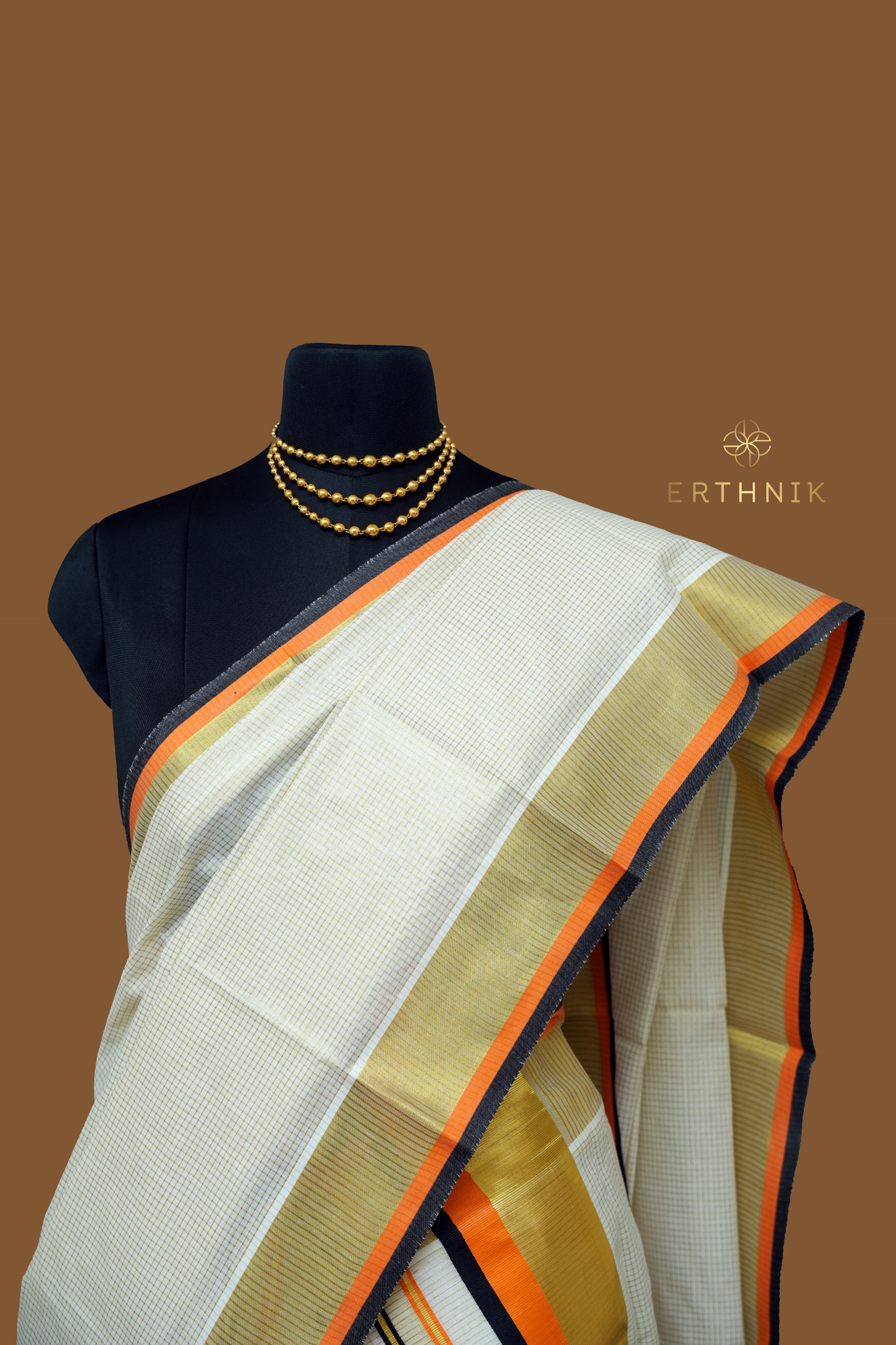 Erthnik™ Kerala Set mundu – Golden Kasavu with Orange & Black Stripe Border