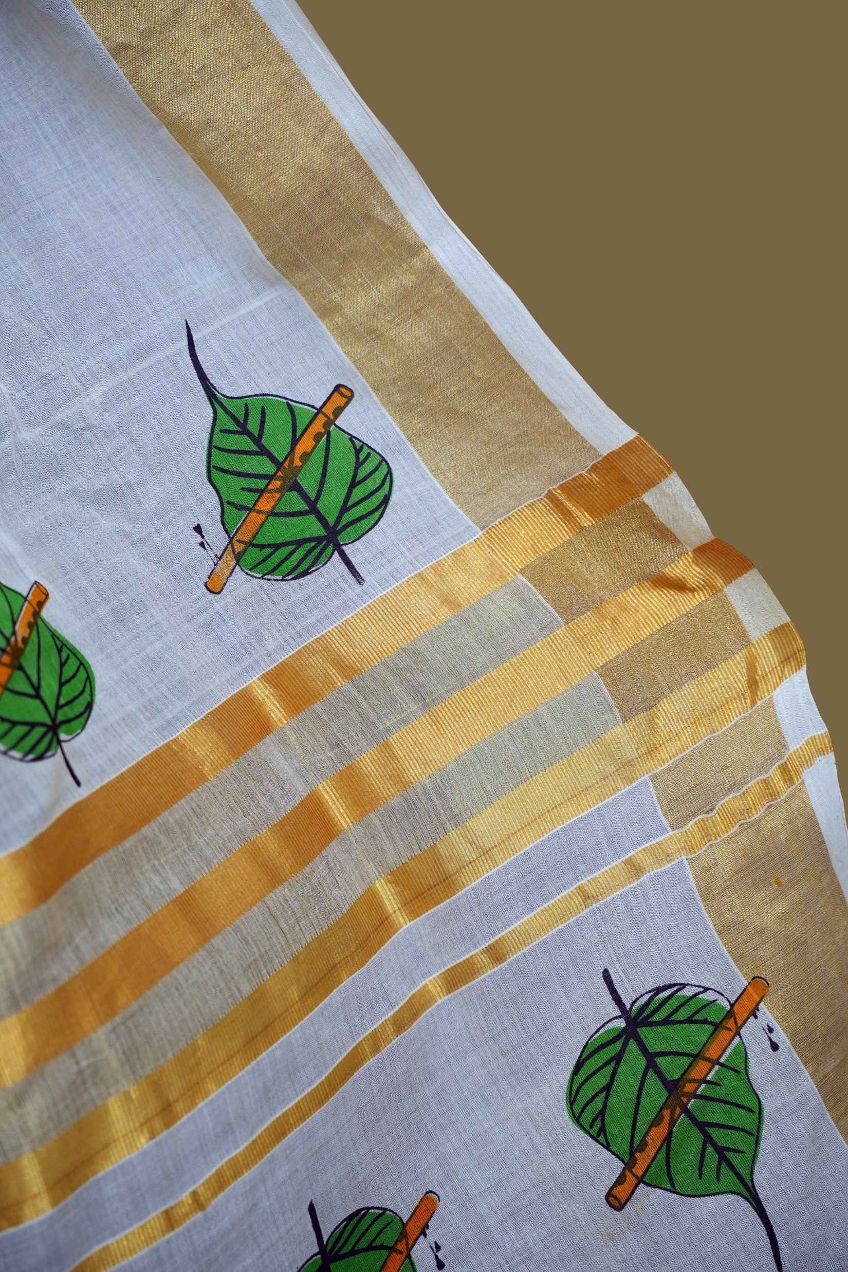 Erthnik™ Kerala Cotton Saree – Leaf Motif with Kasavu Border