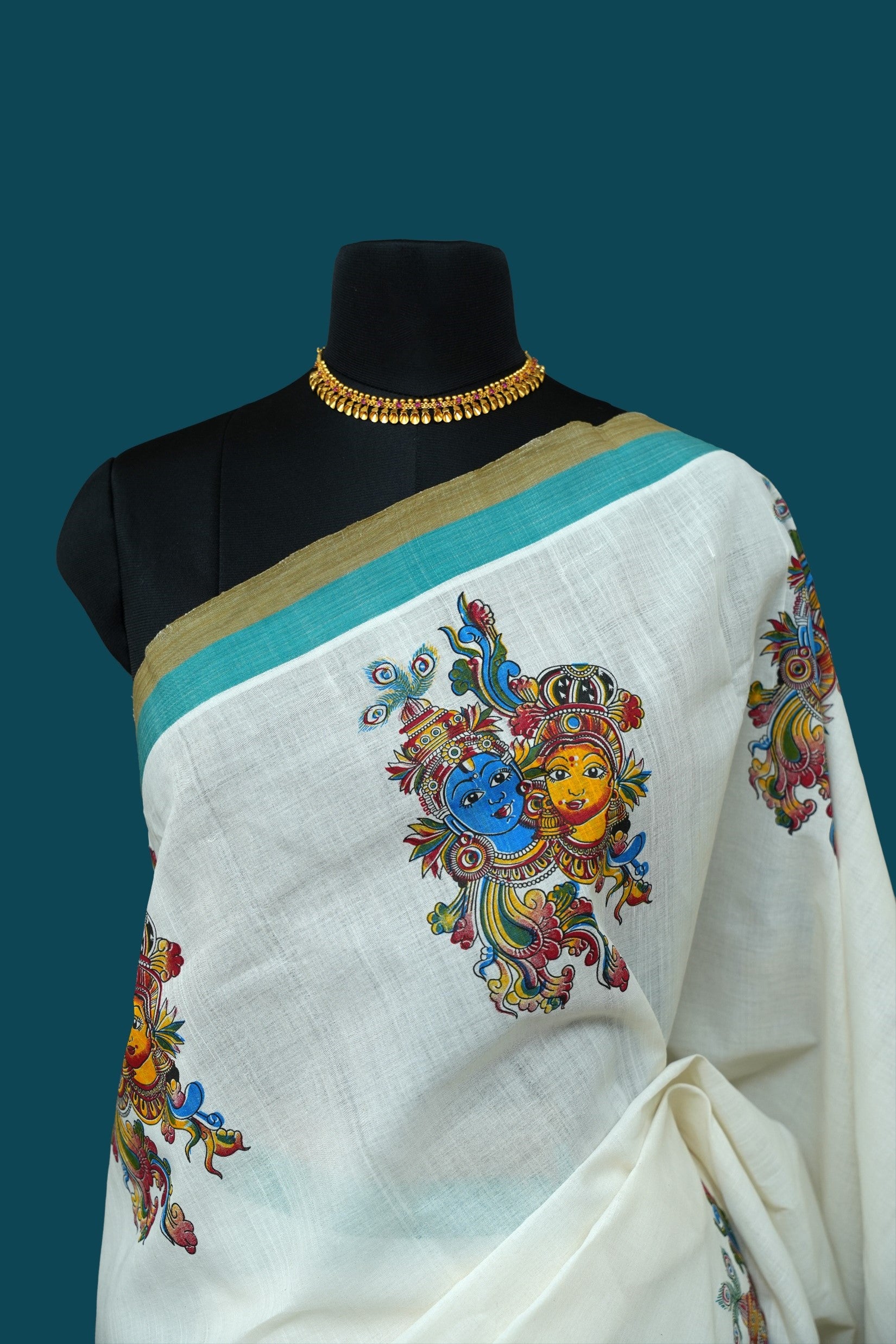 Erthni™k Kerala Cotton Saree – Mural Motif with Teal & Mustard Green Border